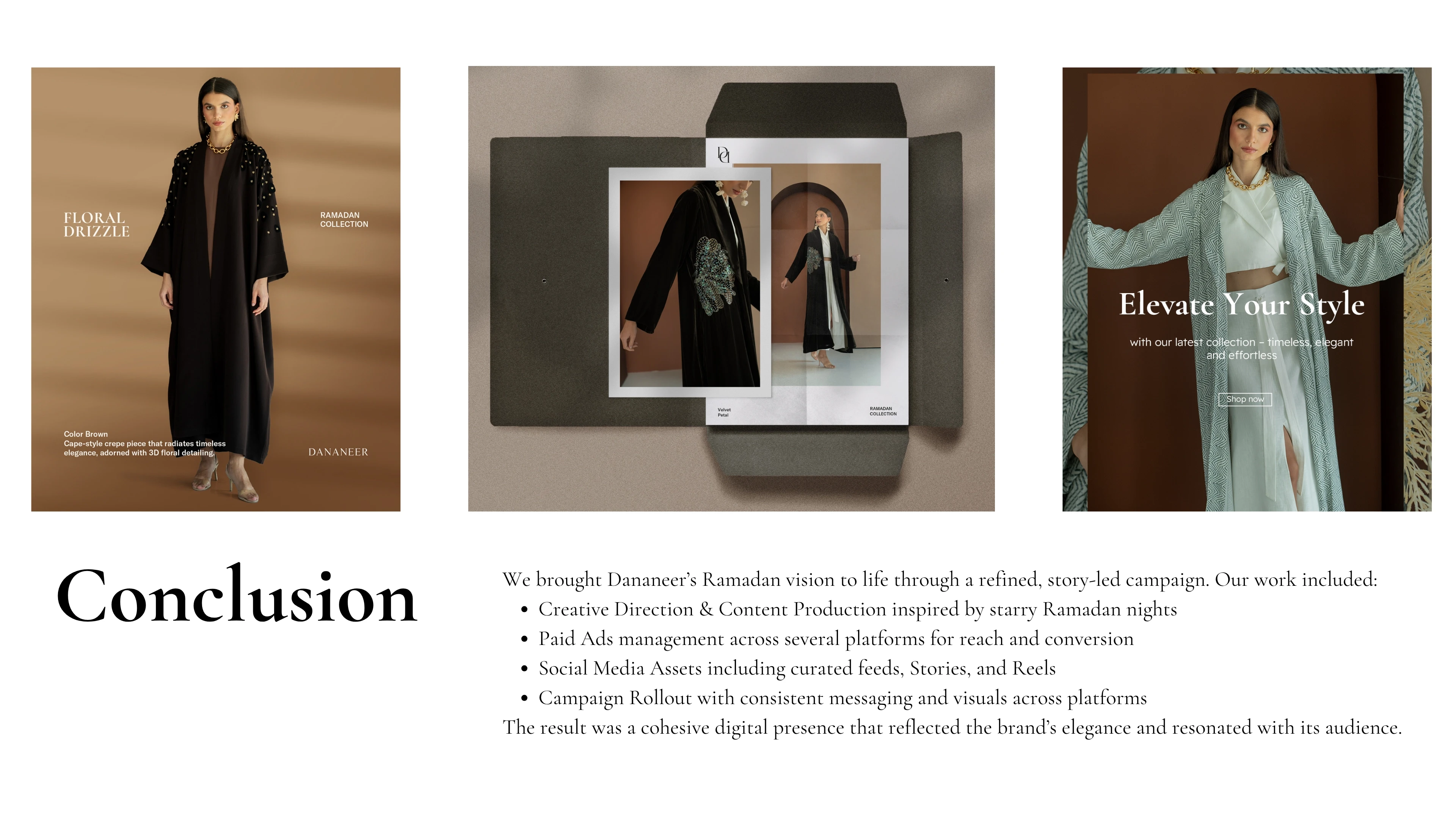 We brought Dananeer’s Ramadan vision to life through a refined, story-led campaign. Our work included: Creative Direction & Content Production inspired by starry Ramadan nights Paid Ads management across several platforms for reach and conversion Social Media Assets including curated feeds, Stories, and Reels Campaign Rollout with consistent messaging and visuals across platforms The result was a cohesive digital presence that reflected the brand’s elegance and resonated with its audience.