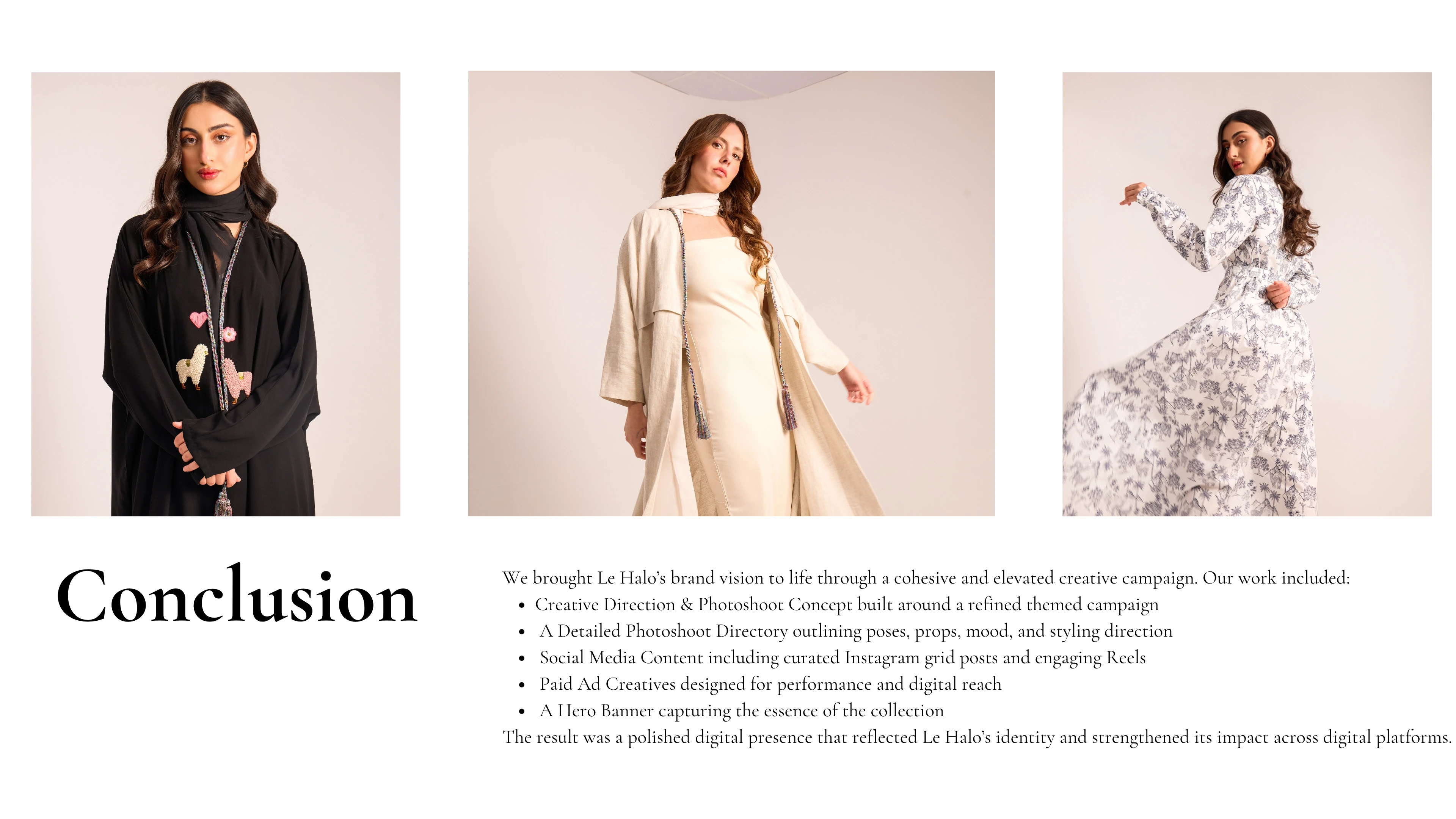 Our collaboration with Le Halo brought the brand’s vision to life through a cohesive and elevated visual strategy. We led the creative direction for a themed photoshoot and campaign, developing a comprehensive photoshoot directory that detailed every element, from poses and props to mood and styling. Beyond the shoot, we crafted impactful content for the Instagram grid, produced engaging reels including paid ad creatives, and delivered a standout hero banner that captured the essence of the collection. Every touchpoint was designed to reflect Le Halo’s identity and position it for growth across digital platforms.